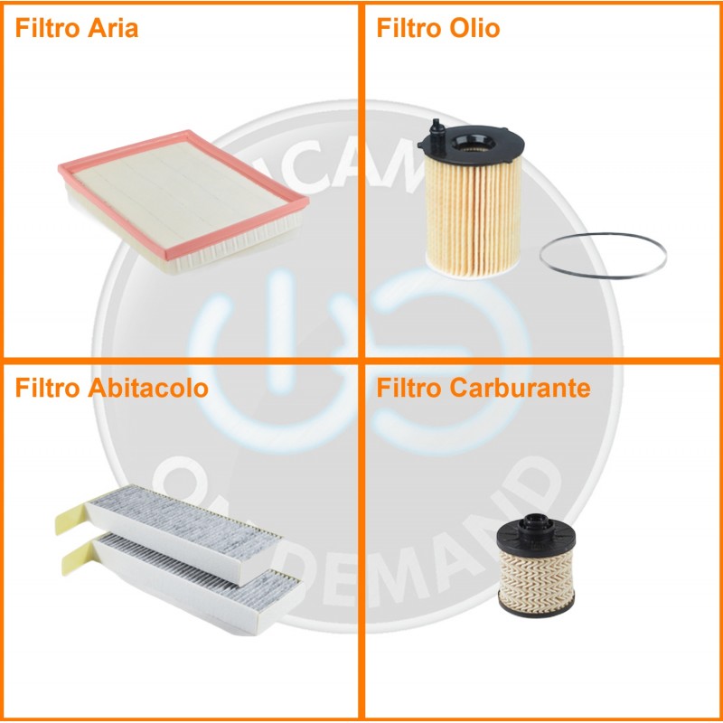 ComposizioneFiltro gasolio, Filtro olio, Filtro abitacolo ai carboni attivi, Filtro aria