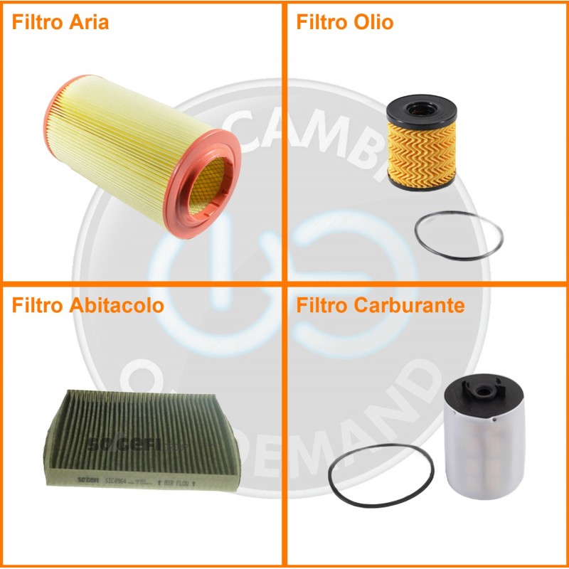 ComposizioneFiltro gasolio, Filtro olio, Filtro abitacolo ai carboni attivi, Filtro aria