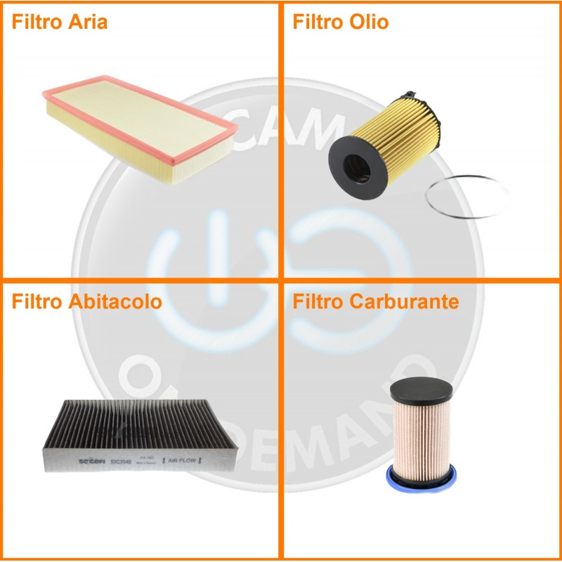 ComposizioneFiltro gasolio, Filtro olio, Filtro abitacolo ai carboni attivi, Filtro aria