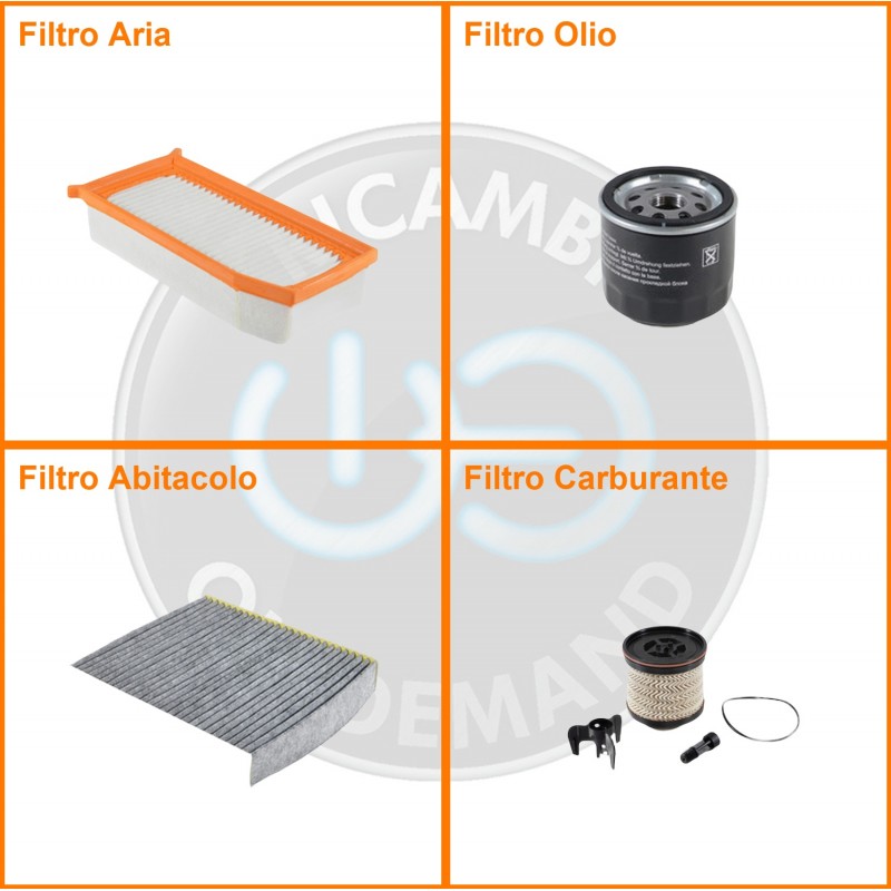 ComposizioneFiltro abitacolo ai carboni attivi, Filtro aria, Filtro gasolio, Filtro olio