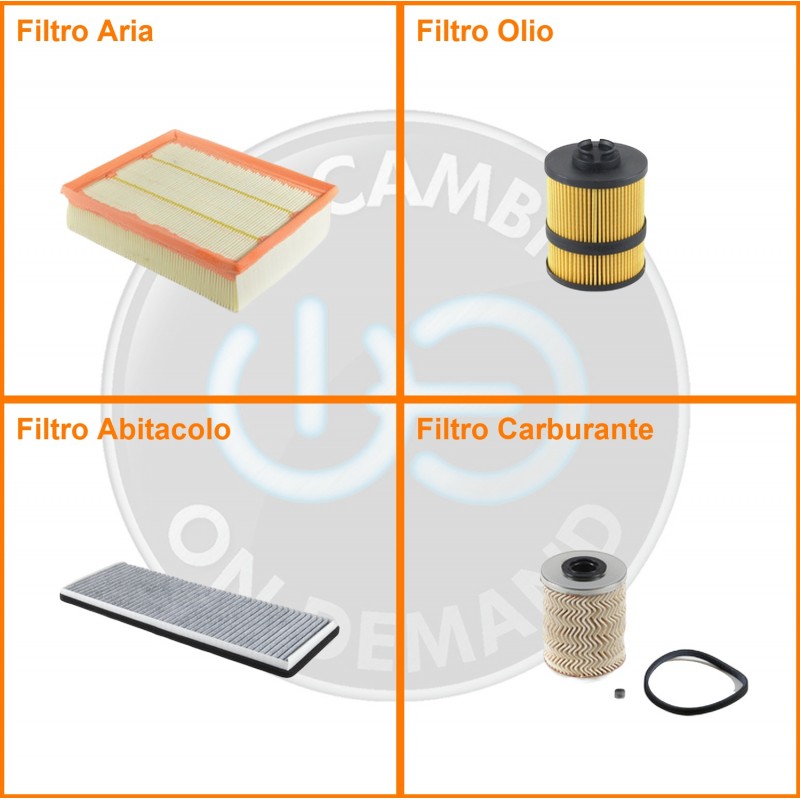 ComposizioneFiltro gasolio, Filtro olio, Filtro abitacolo ai carboni attivi, Filtro aria