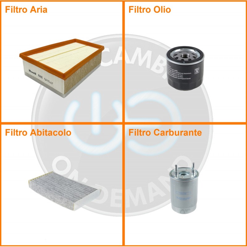 ComposizioneFiltro gasolio, Filtro olio, Filtro abitacolo ai carboni attivi, Filtro aria