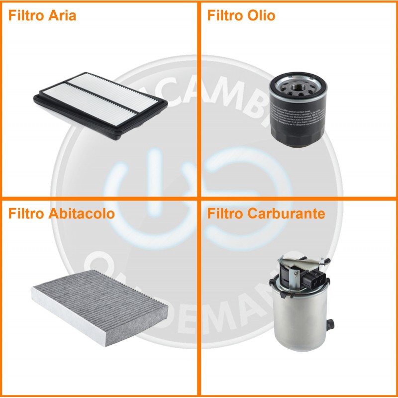 ComposizioneFiltro abitacolo ai carboni attivi, Filtro aria, Filtro gasolio, Filtro olio