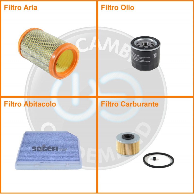 ComposizioneFiltro gasolio, Filtro olio, Filtro abitacolo ai carboni attivi, Filtro aria