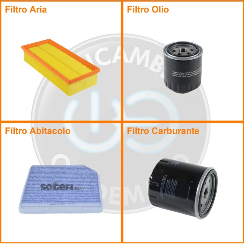 ComposizioneFiltro abitacolo ai carboni attivi, Filtro aria, Filtro gasolio, Filtro olio