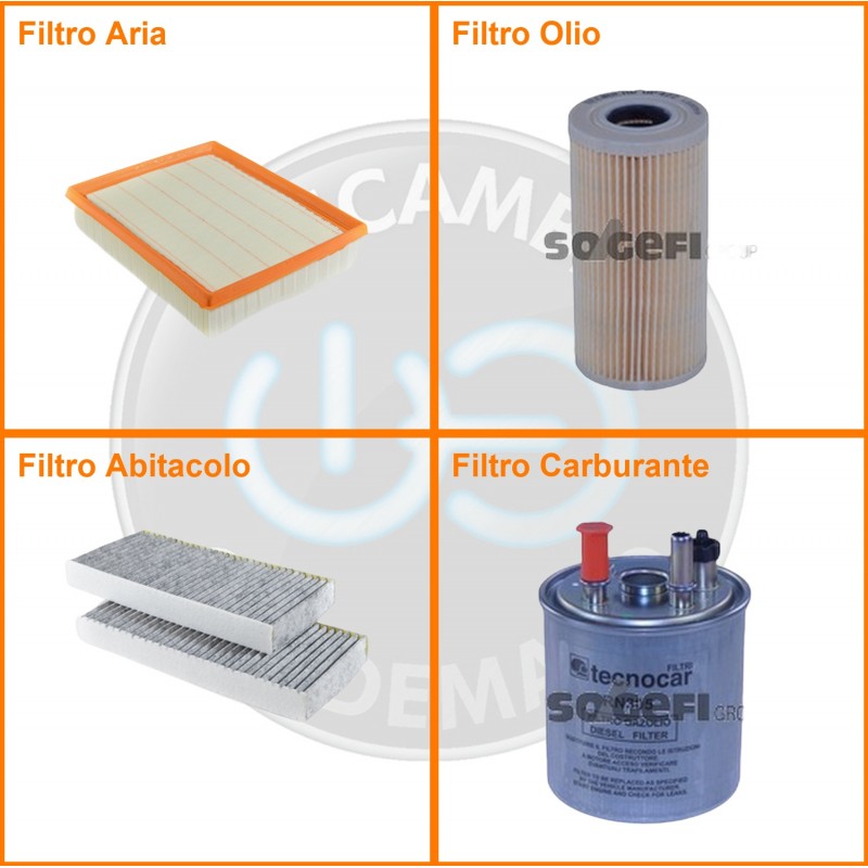 ComposizioneFiltro abitacolo ai carboni attivi, Filtro aria, Filtro gasolio, Filtro olio