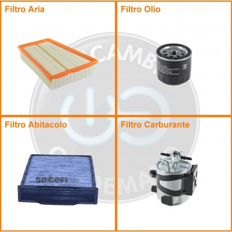 ComposizioneFiltro gasolio, Filtro olio, Filtro abitacolo ai carboni attivi, Filtro aria