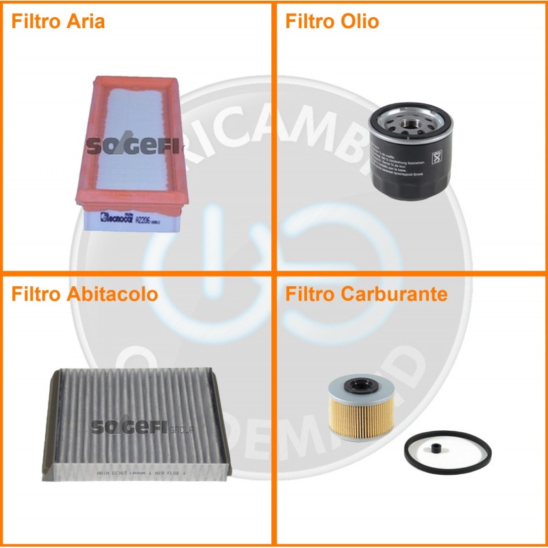ComposizioneFiltro abitacolo ai carboni attivi, Filtro aria, Filtro gasolio, Filtro olio