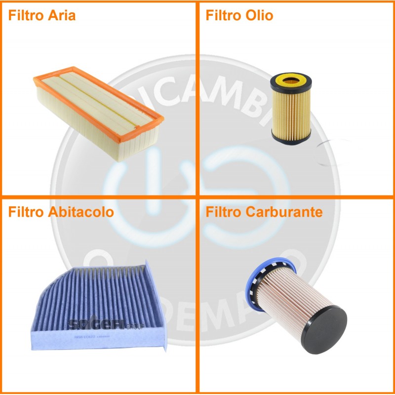 ComposizioneFiltro abitacolo ai carboni attivi, Filtro aria, Filtro gasolio, Filtro olio