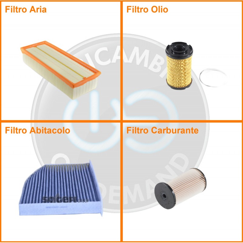 ComposizioneFiltro abitacolo ai carboni attivi, Filtro aria, Filtro gasolio, Filtro olio