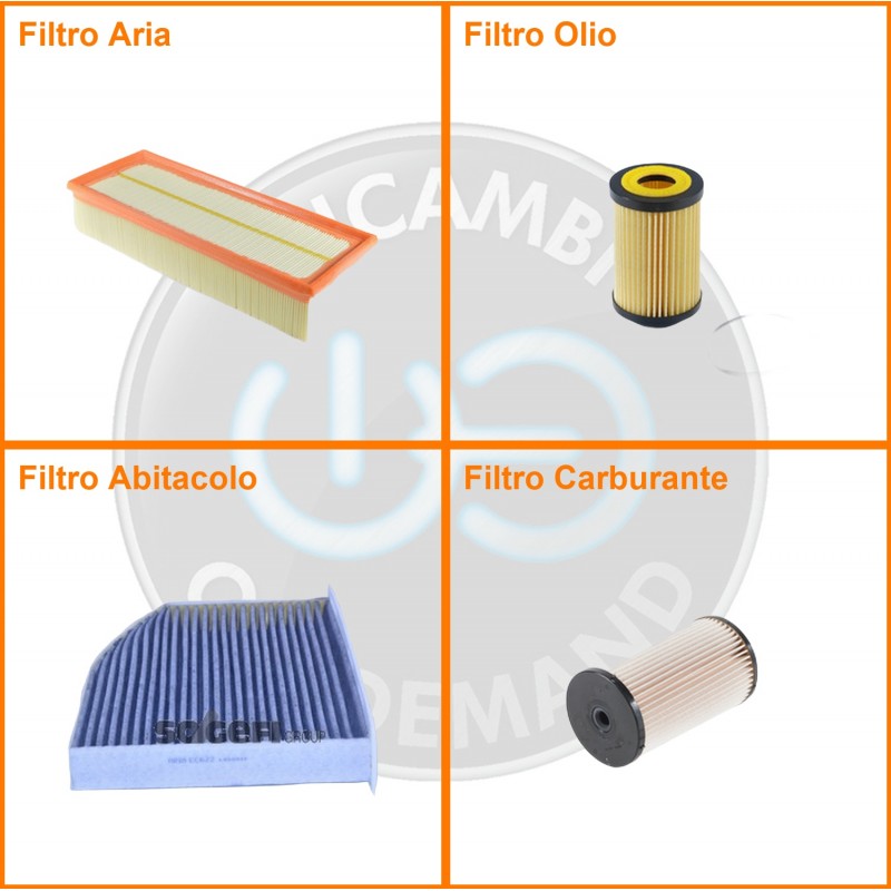 ComposizioneFiltro gasolio, Filtro olio, Filtro abitacolo ai carboni attivi, Filtro aria