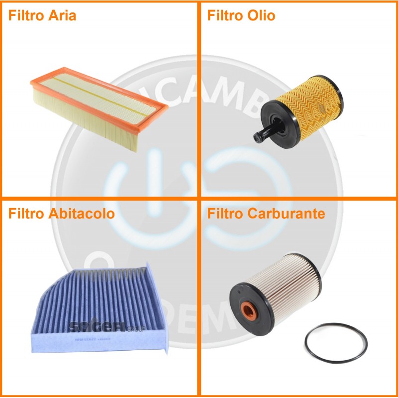 ComposizioneFiltro abitacolo ai carboni attivi, Filtro aria, Filtro gasolio, Filtro olio