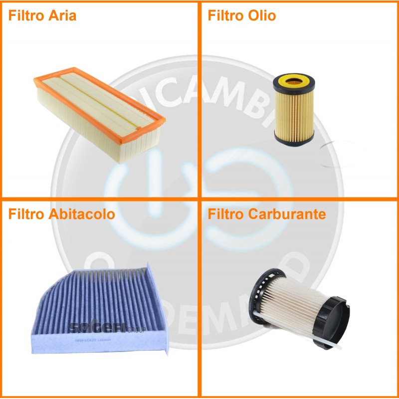 ComposizioneFiltro abitacolo ai carboni attivi, Filtro aria, Filtro gasolio, Filtro olio