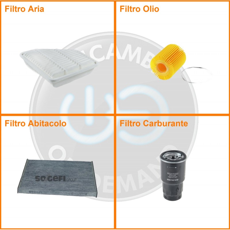 ComposizioneFiltro gasolio, Filtro olio, Filtro abitacolo ai carboni attivi, Filtro aria