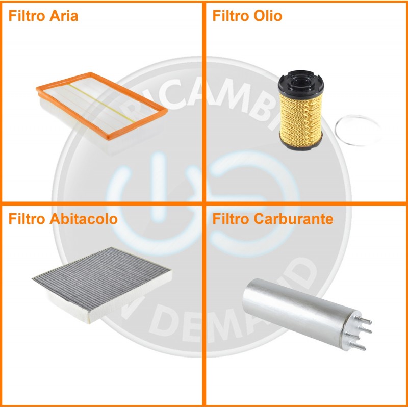 ComposizioneFiltro gasolio, Filtro olio, Filtro abitacolo ai carboni attivi, Filtro aria
