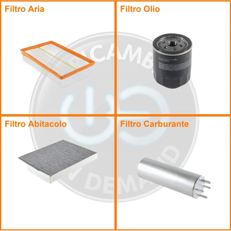 ComposizioneFiltro abitacolo ai carboni attivi, Filtro aria, Filtro gasolio, Filtro olio