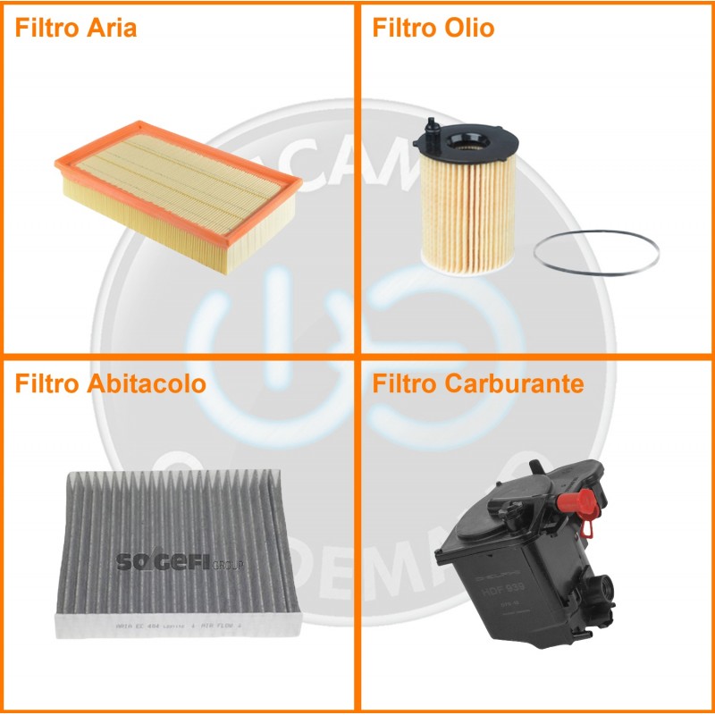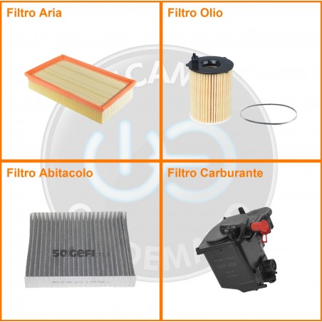 ComposizioneFiltro gasolio, Filtro olio, Filtro abitacolo ai carboni attivi, Filtro aria