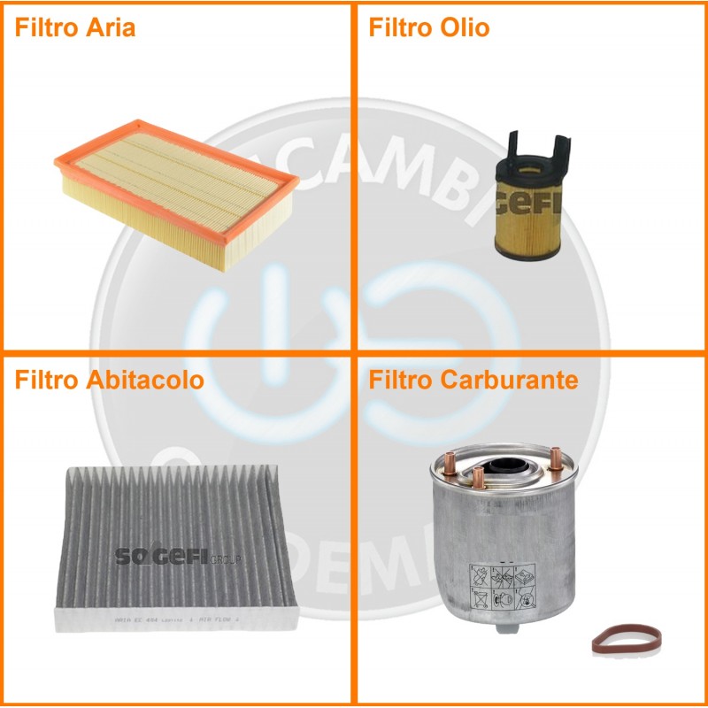 ComposizioneFiltro abitacolo ai carboni attivi, Filtro aria, Filtro gasolio, Filtro olio