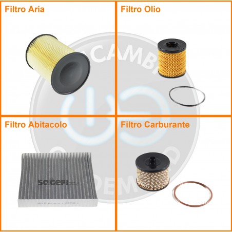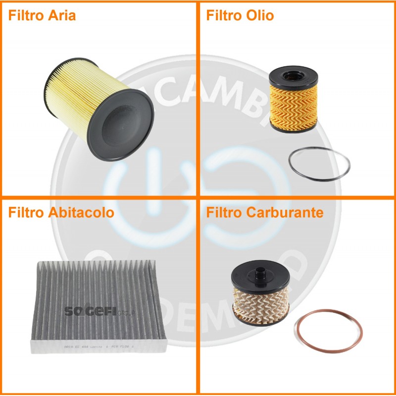 ComposizioneFiltro abitacolo ai carboni attivi, Filtro aria, Filtro gasolio, Filtro olio
