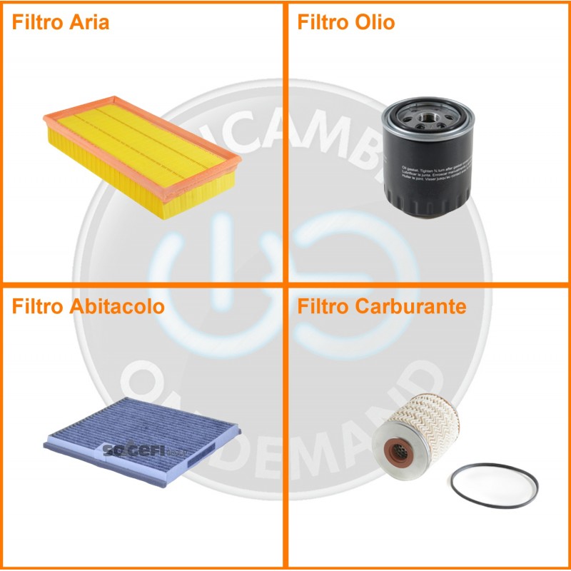 ComposizioneFiltro abitacolo ai carboni attivi, Filtro aria, Filtro gasolio, Filtro olio