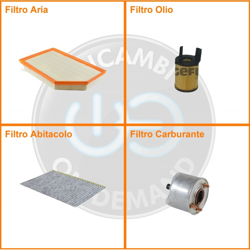 ComposizioneFiltro abitacolo ai carboni attivi, Filtro aria, Filtro gasolio, Filtro olio