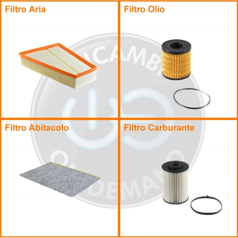 ComposizioneFiltro abitacolo ai carboni attivi, Filtro aria, Filtro gasolio, Filtro olio