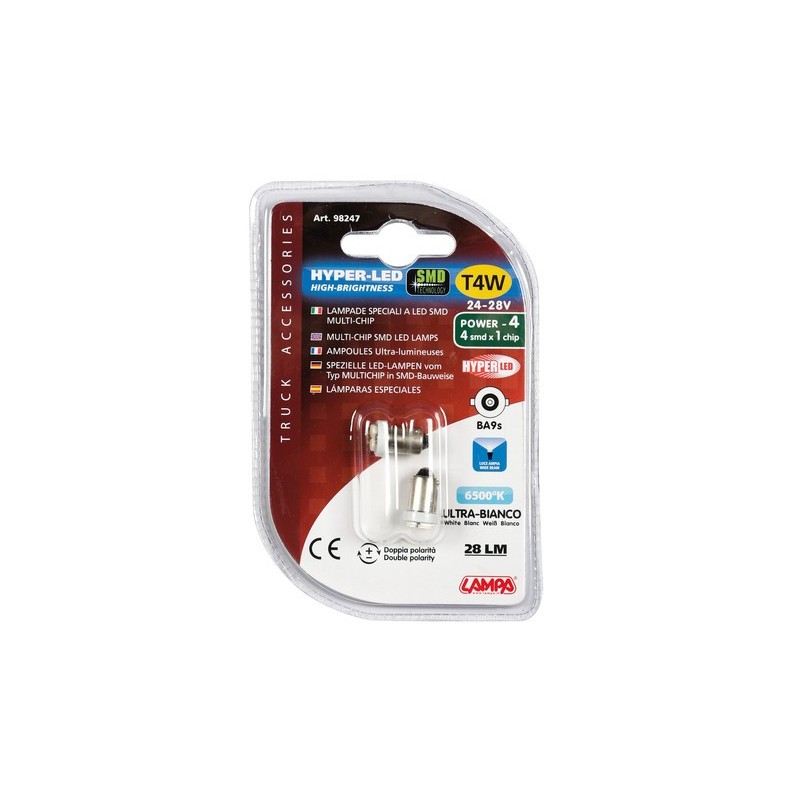 24/28V Hyper-Led 4 - 4 SMD x 1 chips - T4W - BA9s - bianco - Doppia polarita'